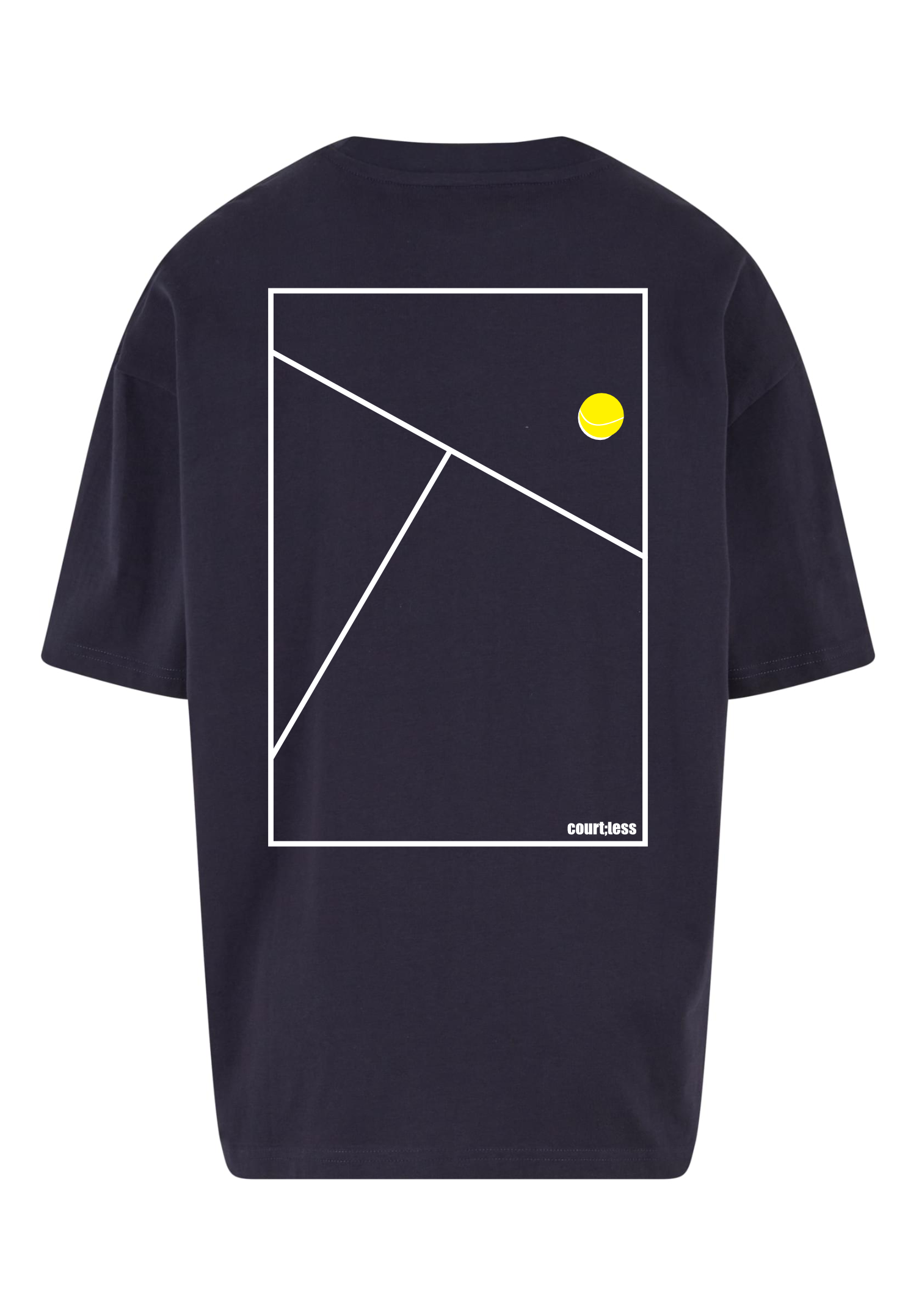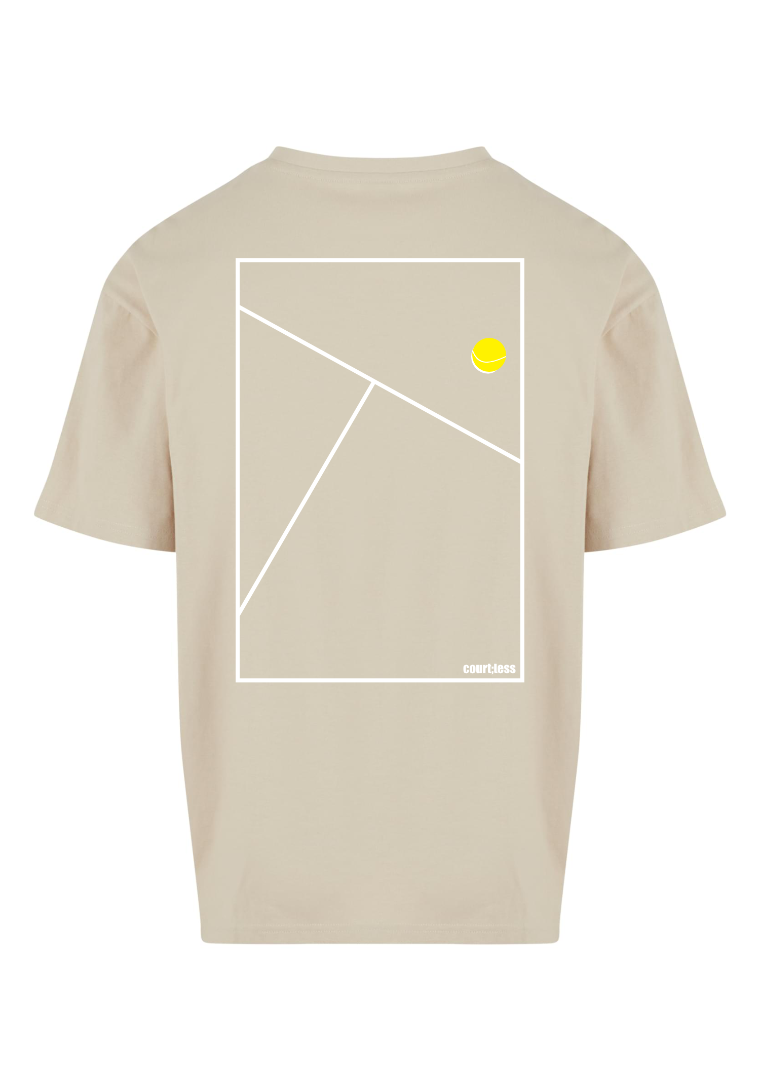 The Court Tee übersetzt den Geist des Spiels in eine moderne, grafisch reduzierte Form. Der geometrische Backprint kombiniert klare Linien mit einem Tennisball-Motiv und transportiert den Vibe klassischer Courts in ein zeitloses Streetwear-Piece – clean, subtil, sportlich.